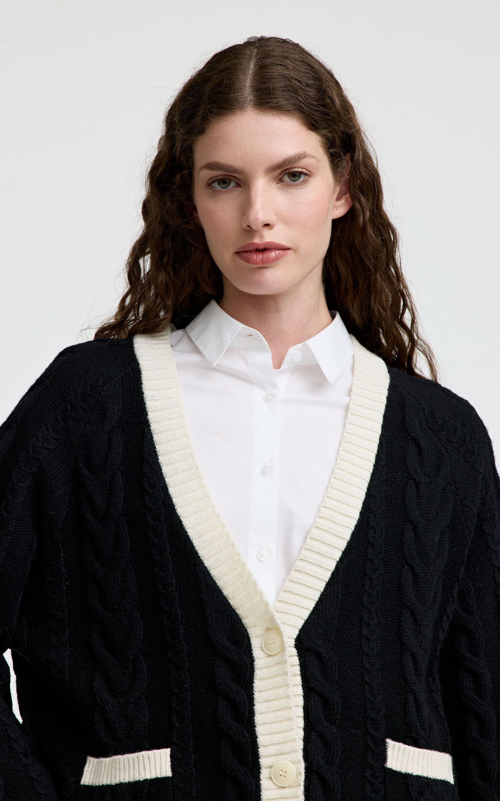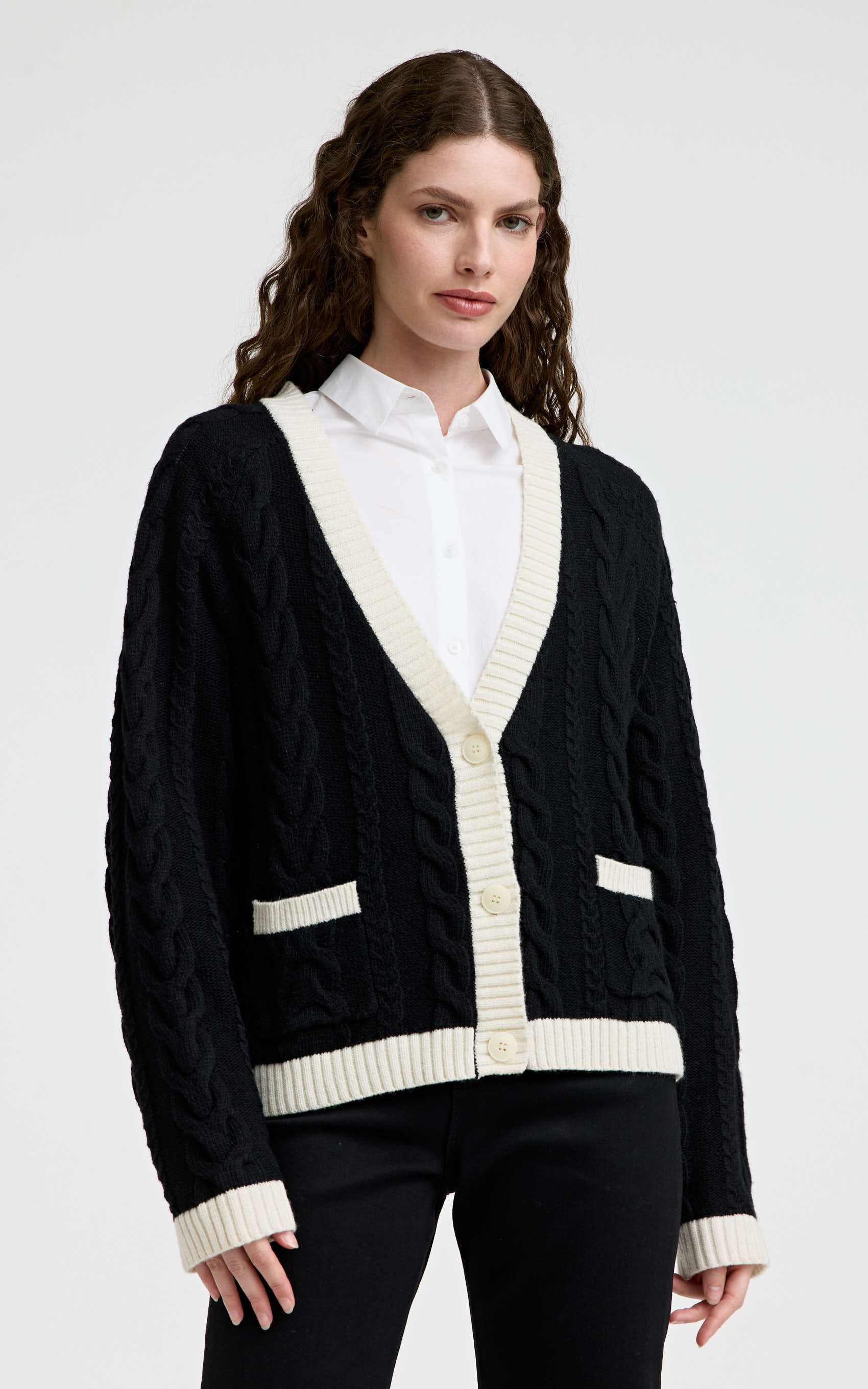 Cardigan a dos colores con trenzas. Cuello, cartera, puños de manga, ruedo y boca de bolsillso tejidos en punto ribb en color off white. Cuerpo y mangas tejidos con trenzas en color negro. Acceso a través de cartera en centro delantero con botones marcarios. En delantero inferior lleva bolsillos. Posee corona bordada en delantero. PRODUCTO IMPORTADO.