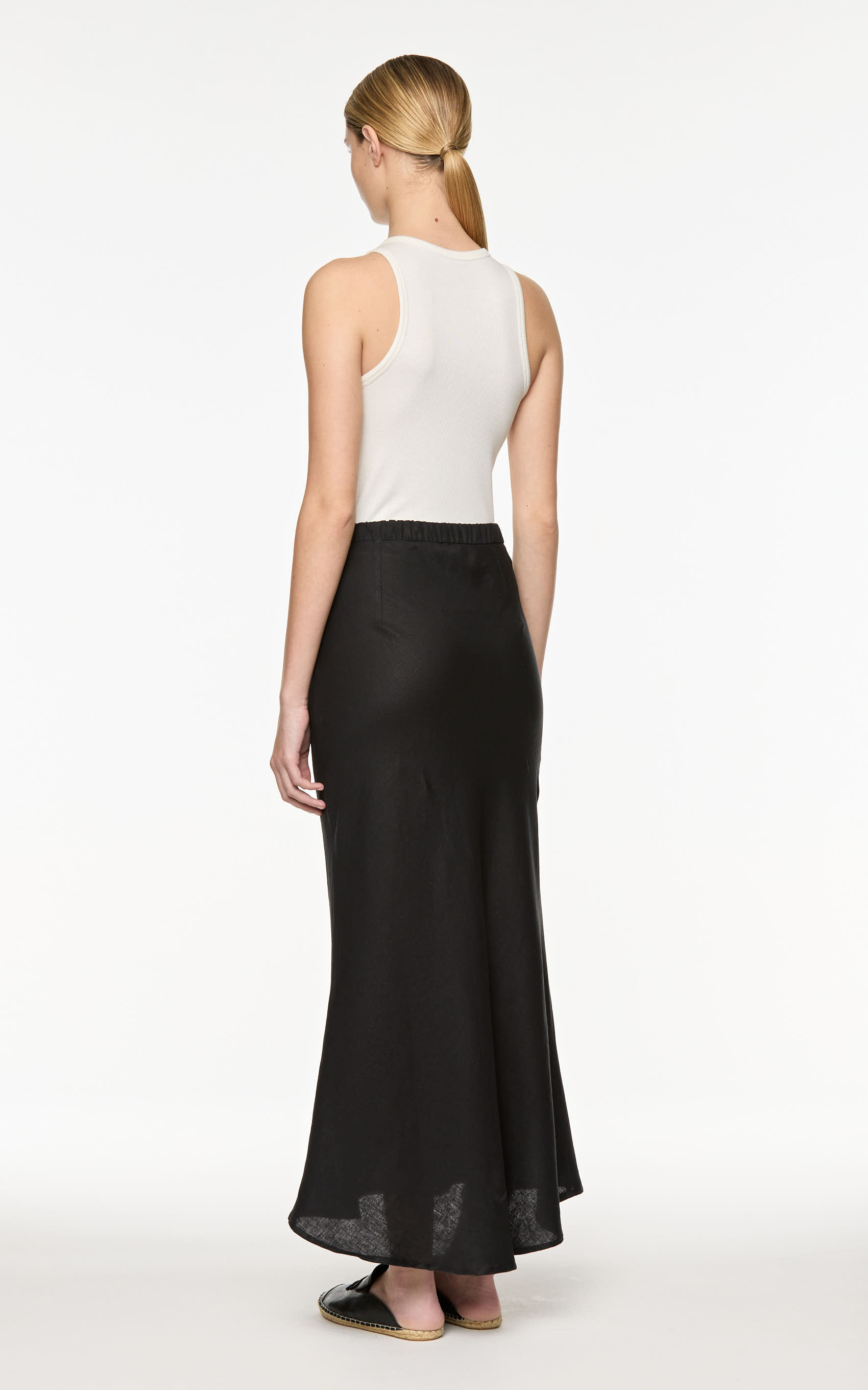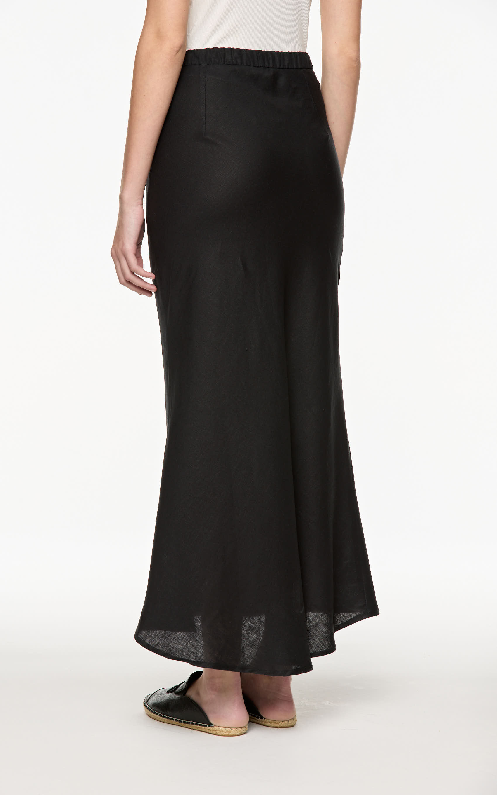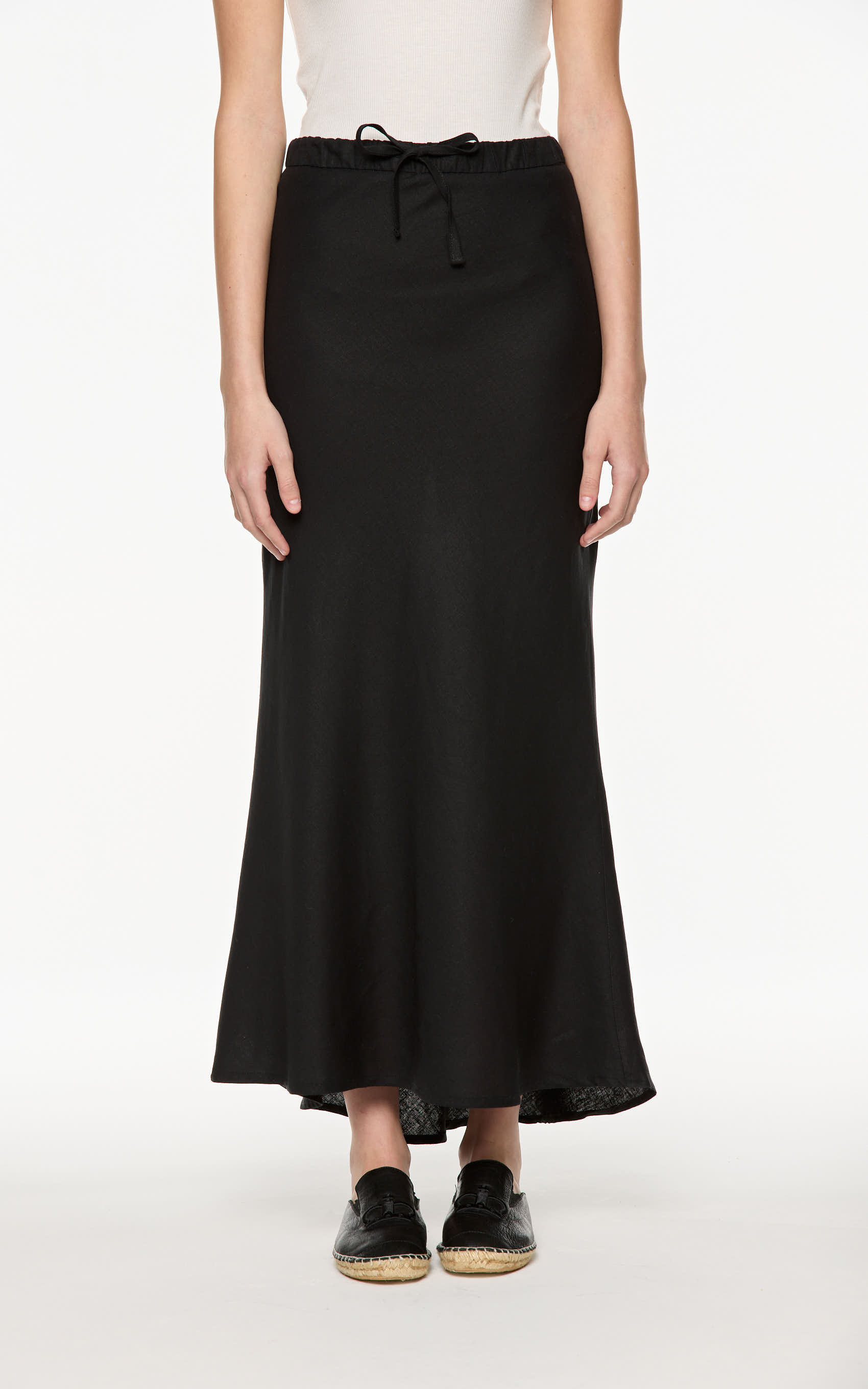 Pollera larga desarrollada en lino mezcla. Largo delantero de prenda irregular. Posee cintura con elastico y lazo en tela base que pasa por jareta en cintura para su ajuste. Lleva corona bordada. Textil fabricado en oriente. Diseñada para acompañar looks frescos y auténticos, sin resignar comodidad ni estilo.