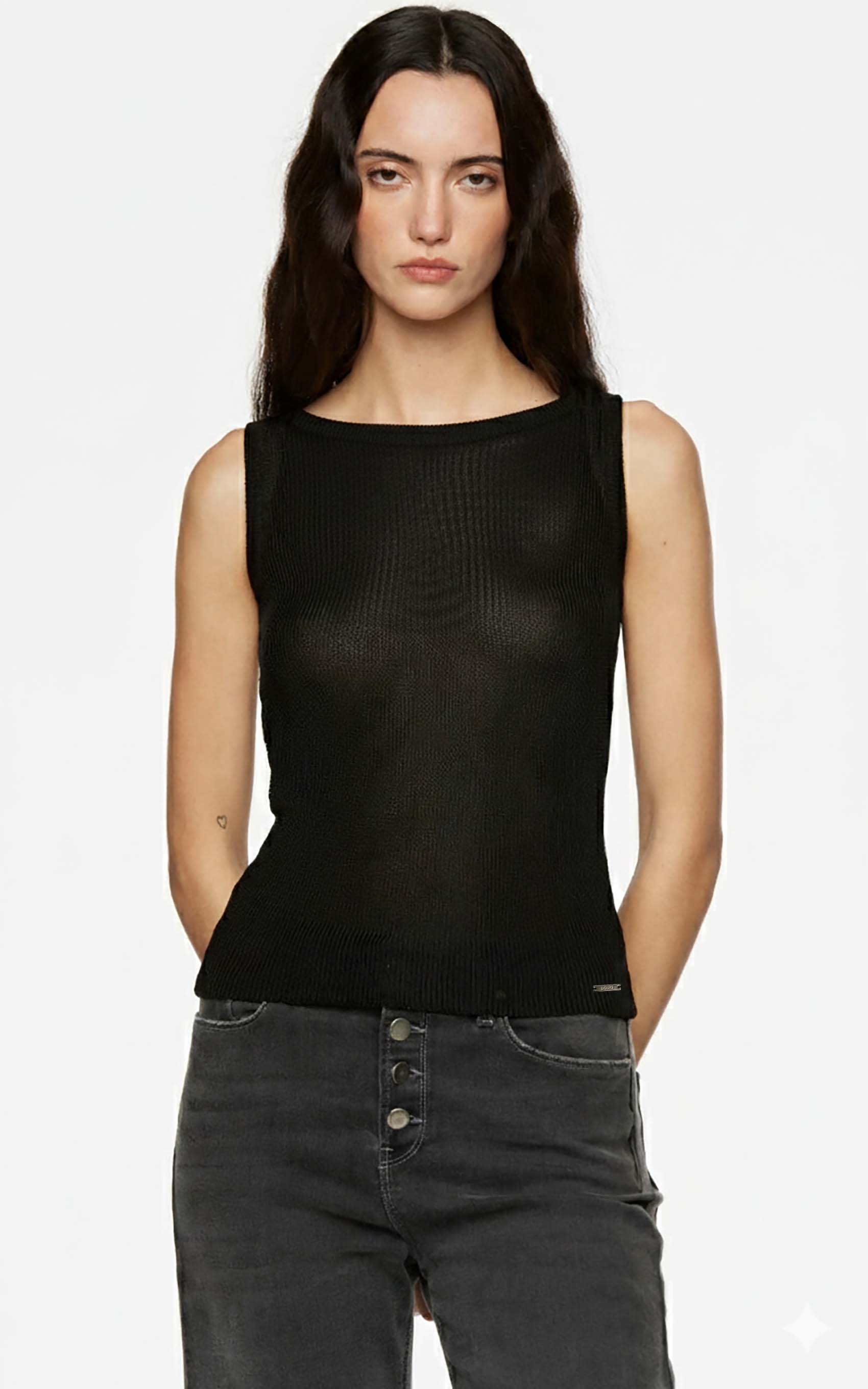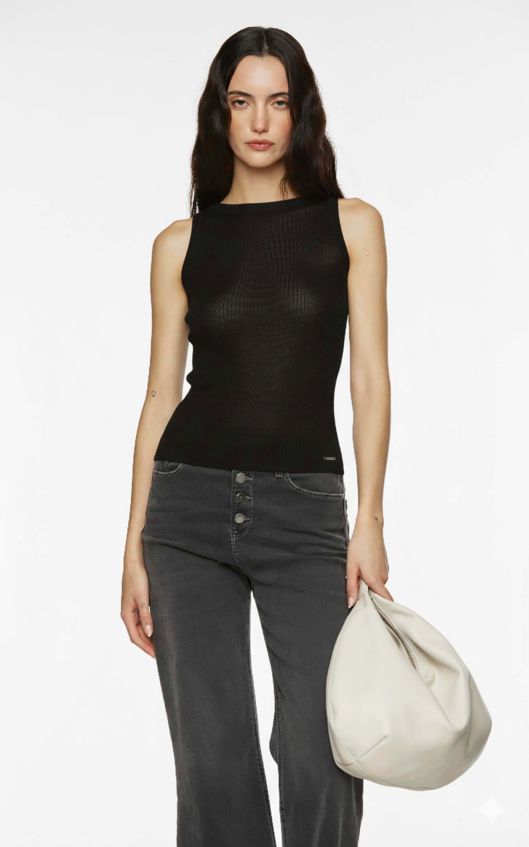 Top tejido en punto perlé sin mangas. Escotre de espalda cavado. Lleva chapita metalica marcaria. Una prenda imprescindible para la temporada, ideal para sumar a looks relajados o urbanos.