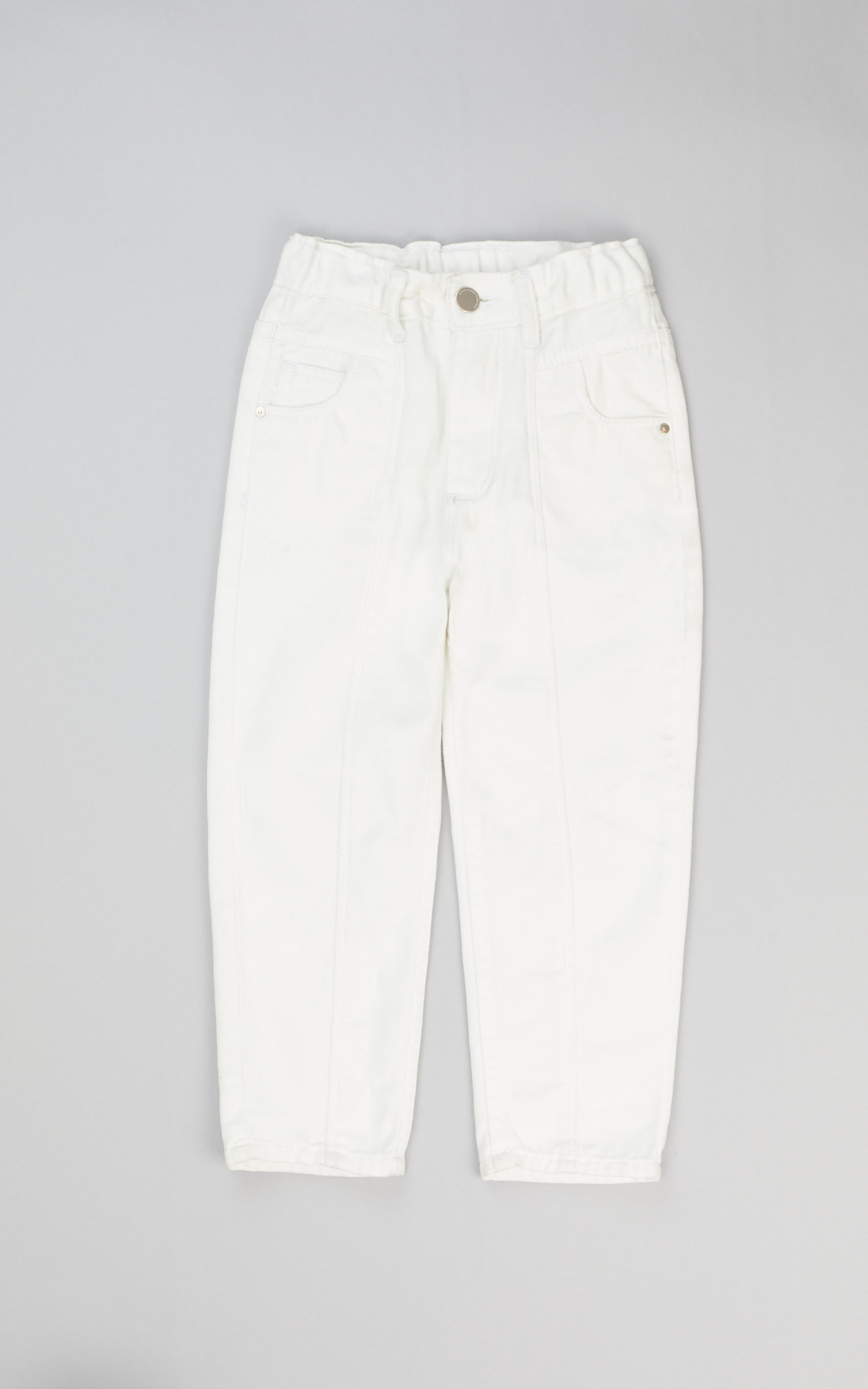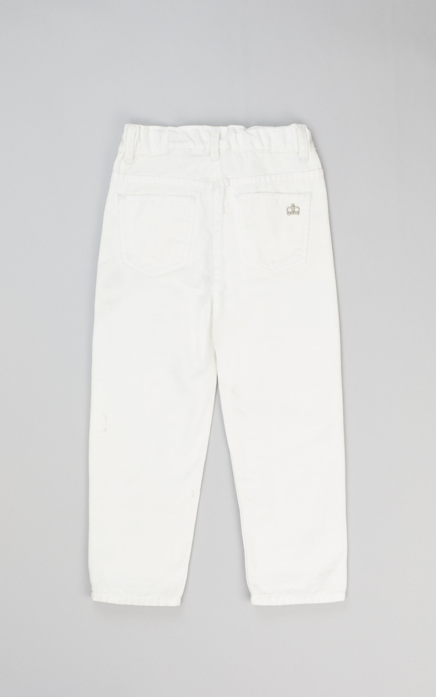 pantalón en gabardina 100% algodón. Cintura alta, recortes delanteros en piernas. Es un modelo más ancho arriba y se va afinando hacia la boca de piernas. Tiene elástico interno en cintura con ojal y botones para ajustar a la medida de cada cintura.. Corona metálica en bolsillo trasero. Botón y cierre metálico.