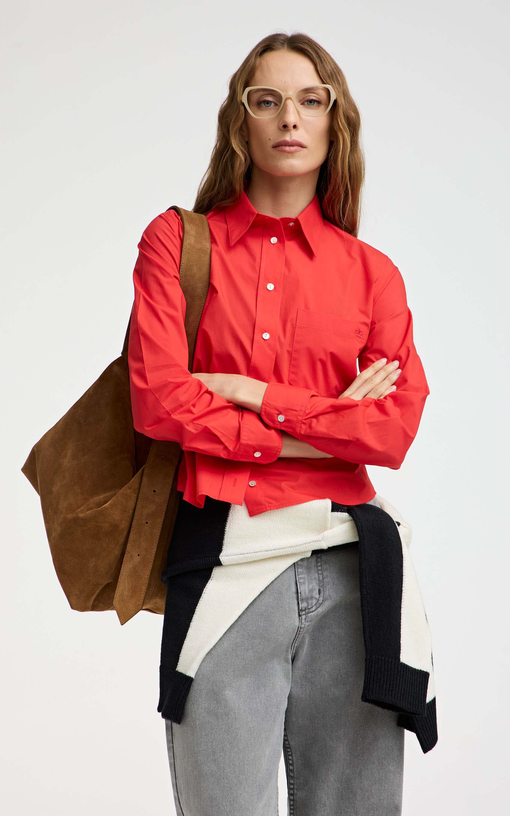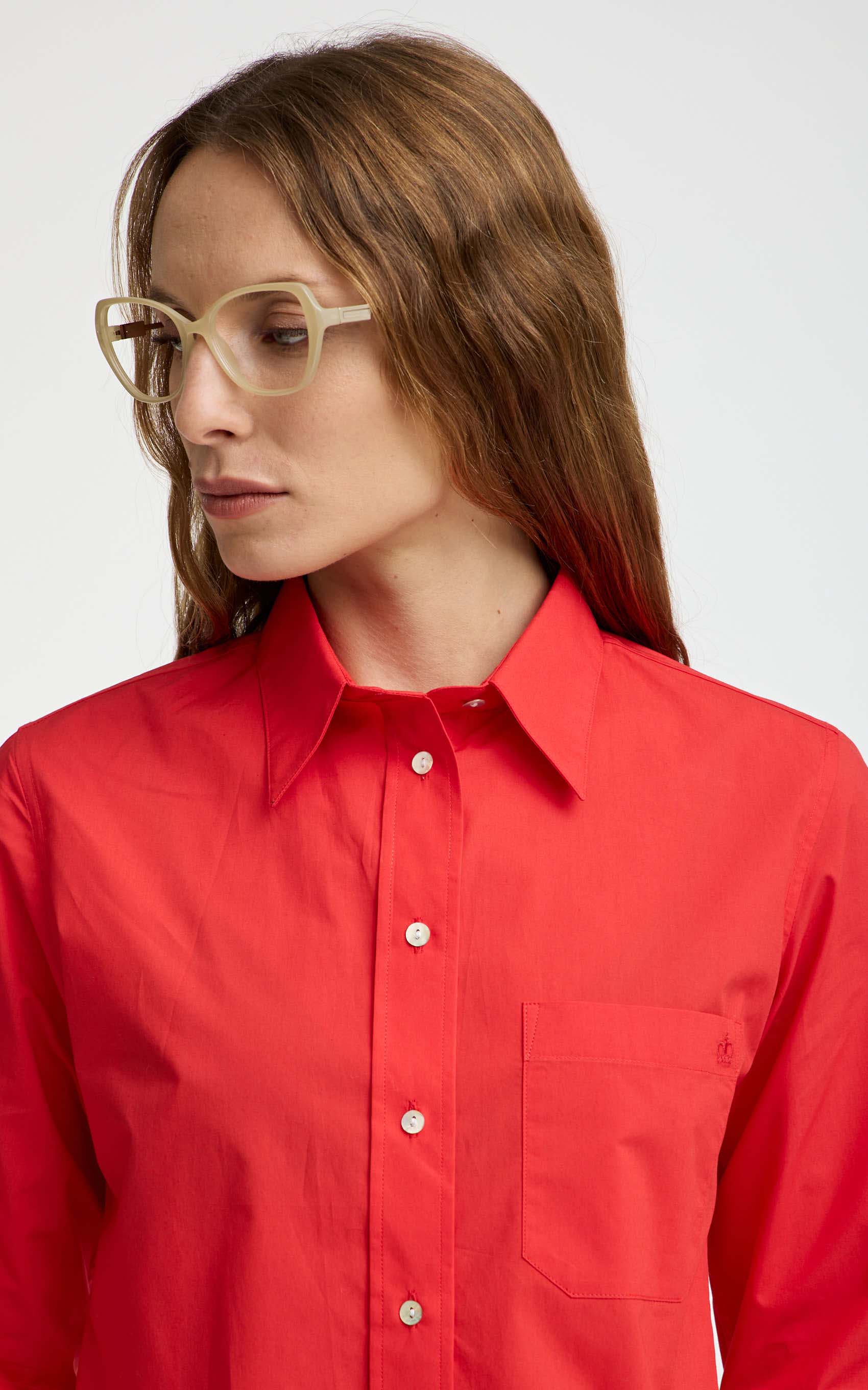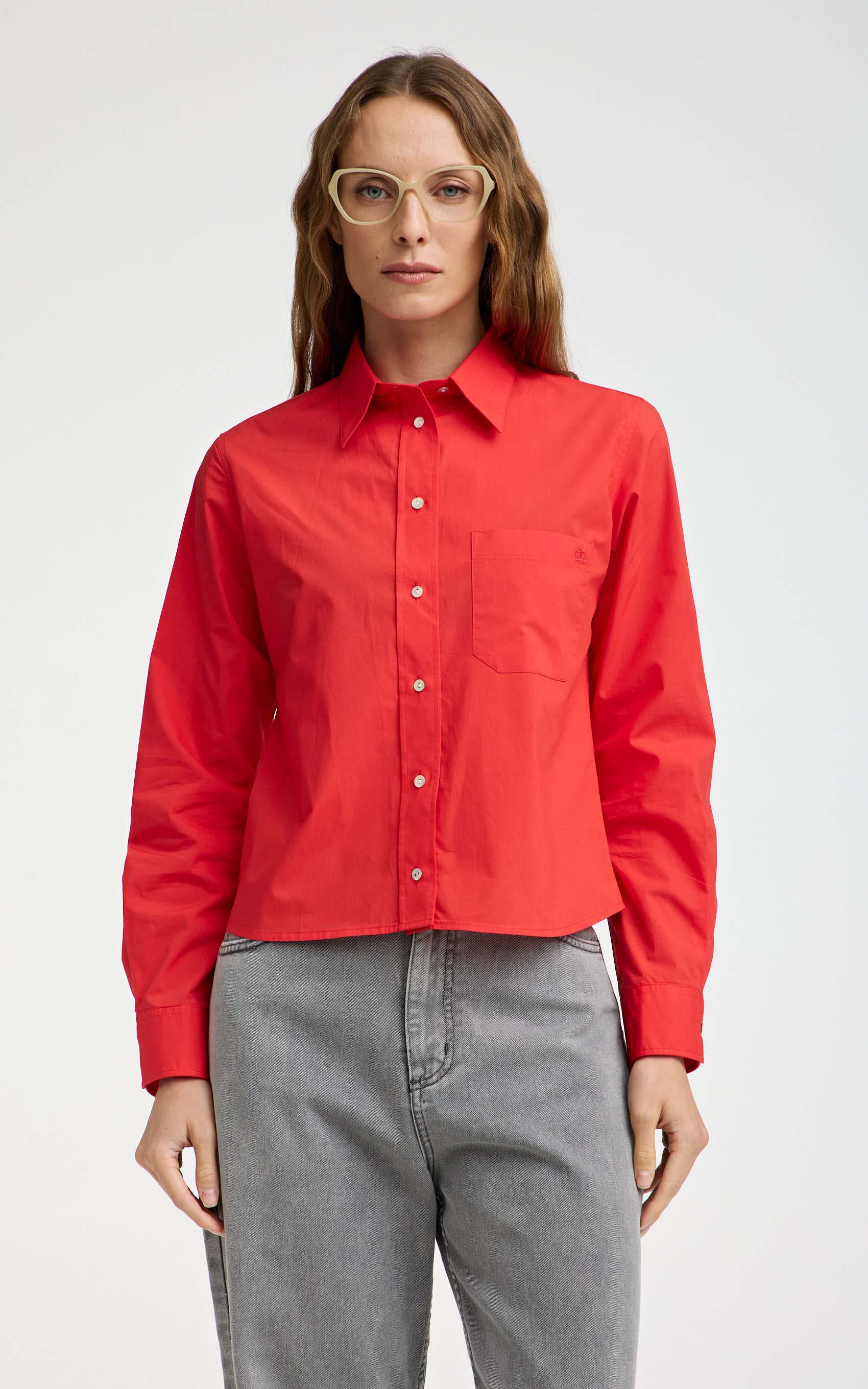 Camisa básica de mangas largas con cartera central y botones nácar a la vista. Tiene pinzas de entalle en espalda. Canesú en espalda y logo bordado a tono de la base en bolsillo delantero.