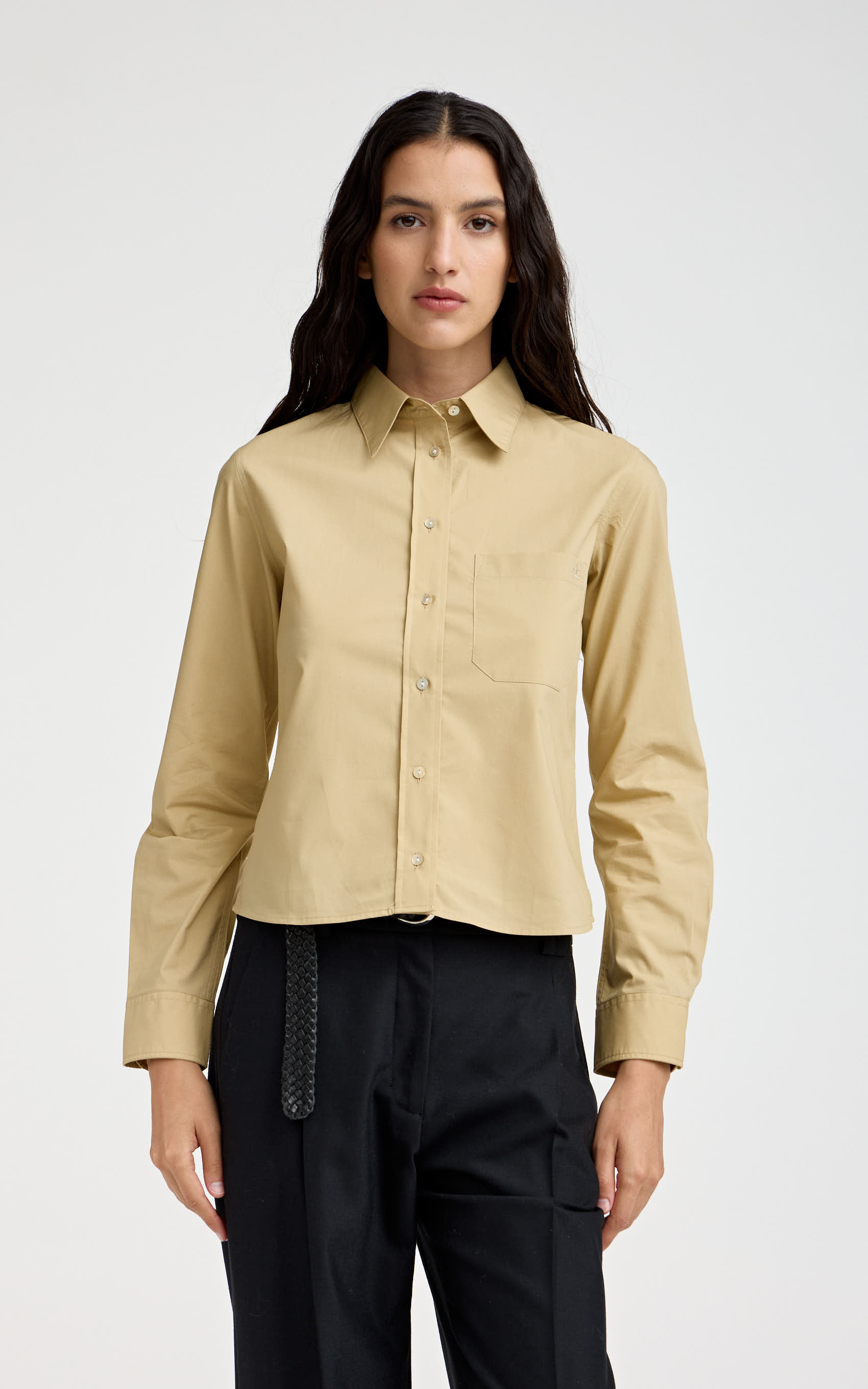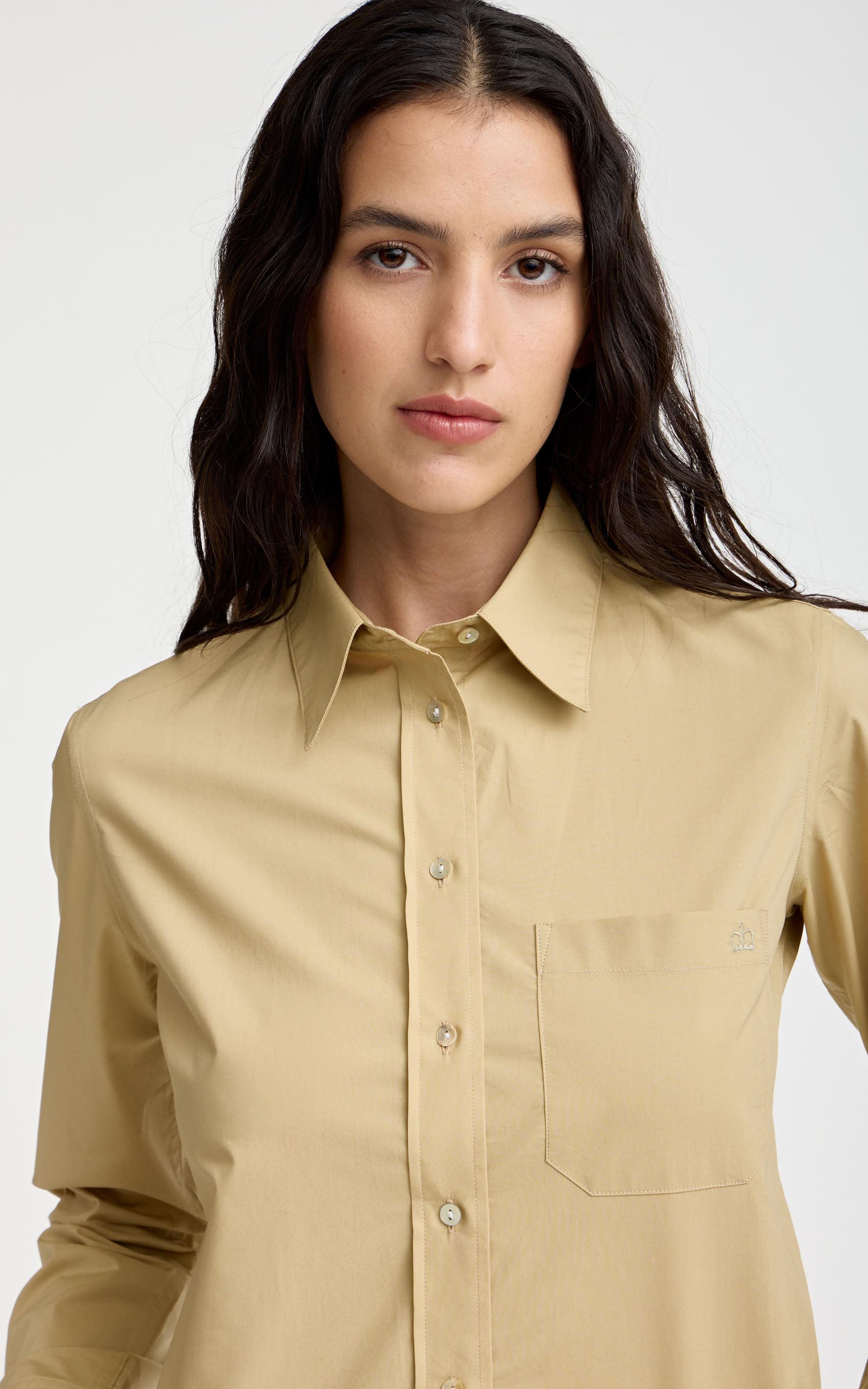 Camisa básica de mangas largas con cartera central y botones nácar a la vista. Tiene pinzas de entalle en espalda. Canesú en espalda y logo bordado a tono de la base en bolsillo delantero.