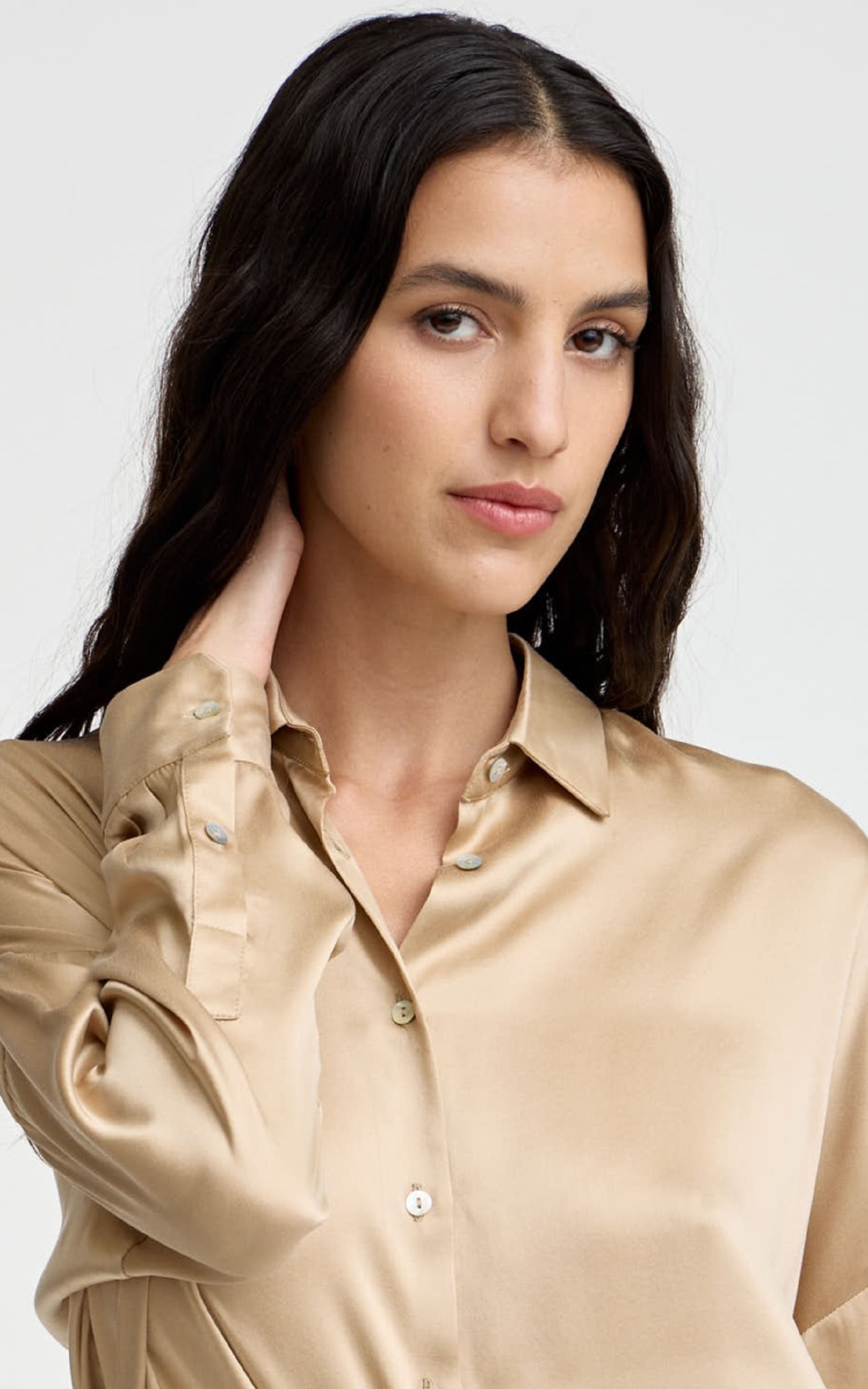 Camisa manga larga desarrollada en seda .Silueta oversize .Acceso a traves de cartera en centro delantero con botones marcarios. Posee hombro caido y chapita metalica marcaria.
