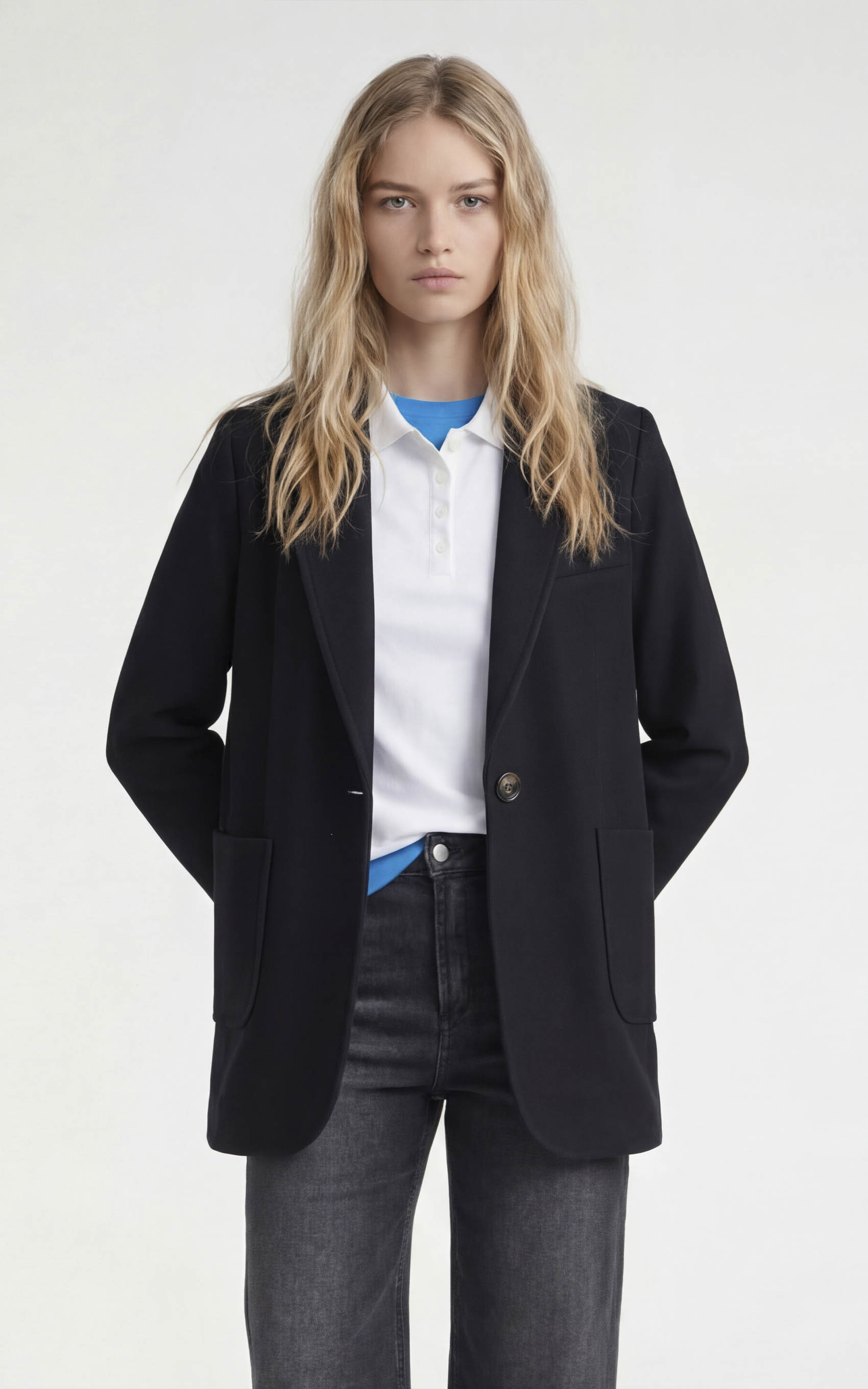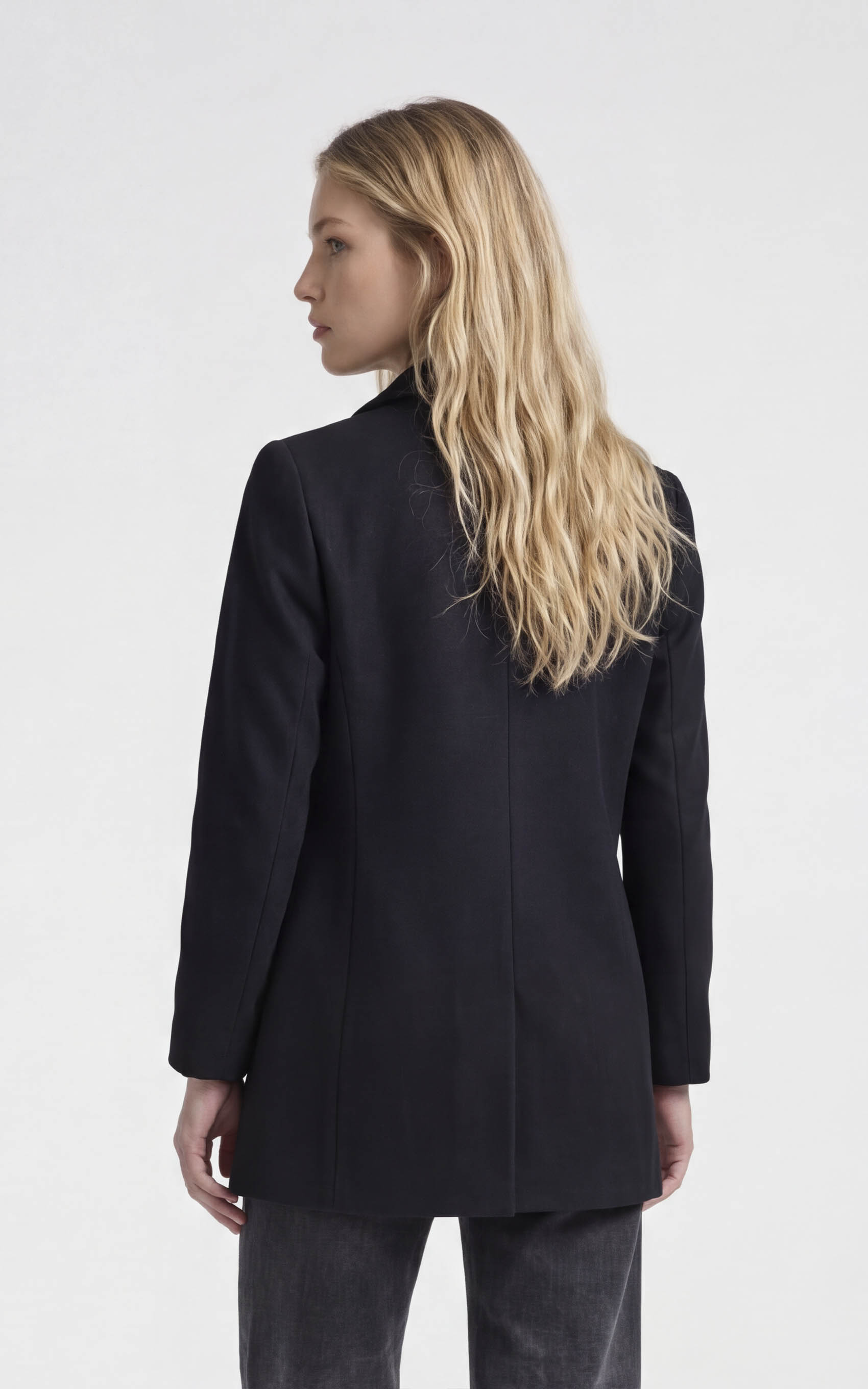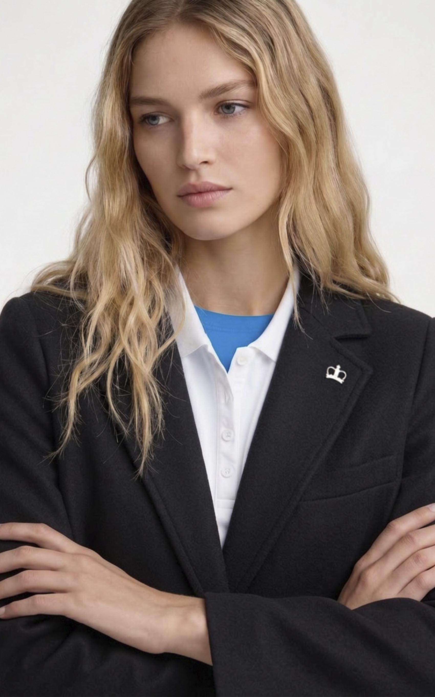 Tapado sastrero de paño, largo hasta mitad de muslos, con solapa y cuello con espejo, lleva pin metálico corona en solapa izquierda. Con bolsillo ojal pañuelero en el pecho izquierdo y bolsillos plaqué en delantero. Cruce y abotonadura simple. Interior con forrería de acetato.